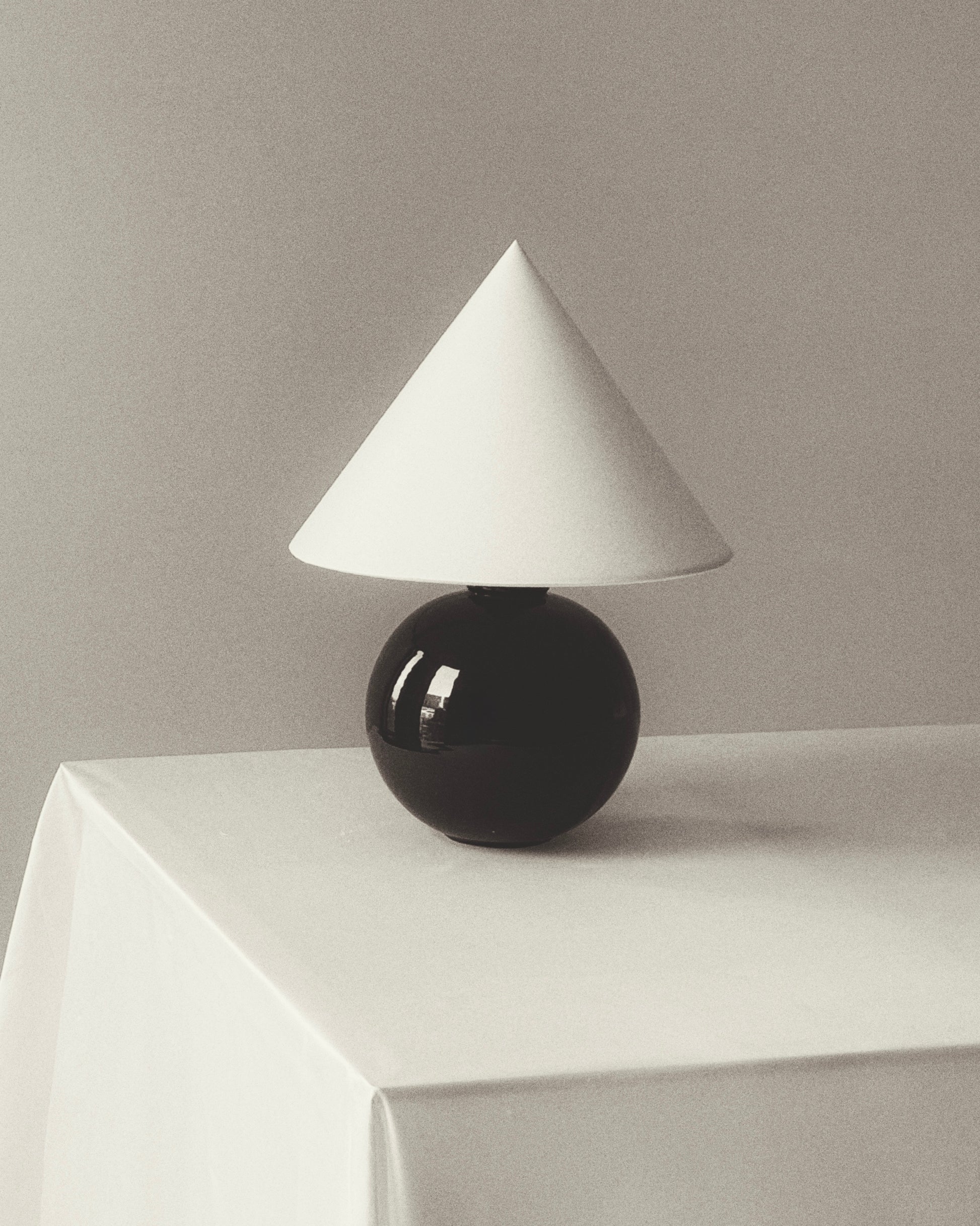 Hand-glazed ceramic base and conical lampshade in soft eggshell silk. Made in Montreal. Each piece is individually made, offering subtle variations that make every lamp one of a kind. Designed with a North American plug and crafted in limited quantities, this is a final sale item with no returns or exchanges.