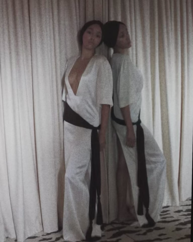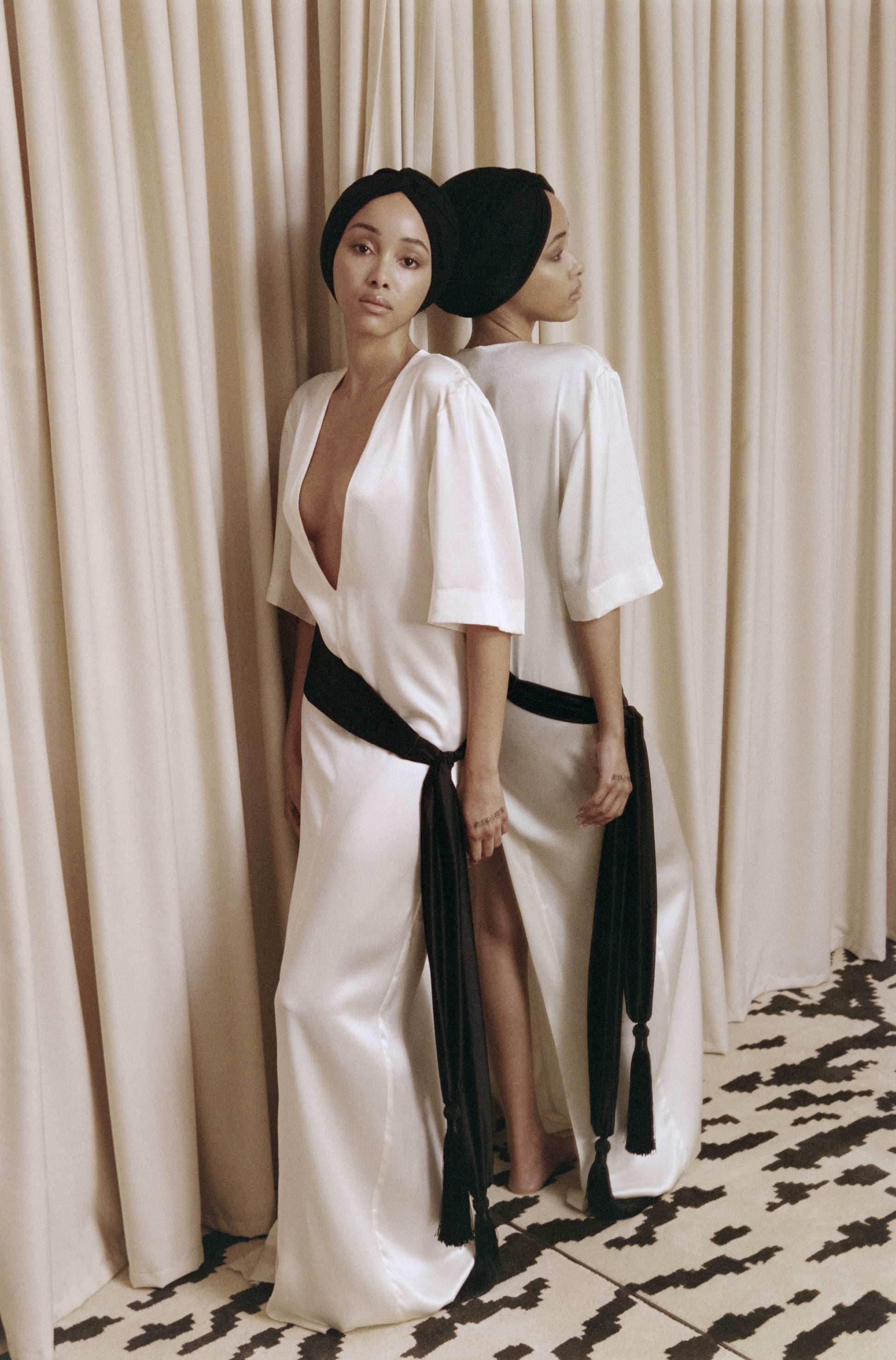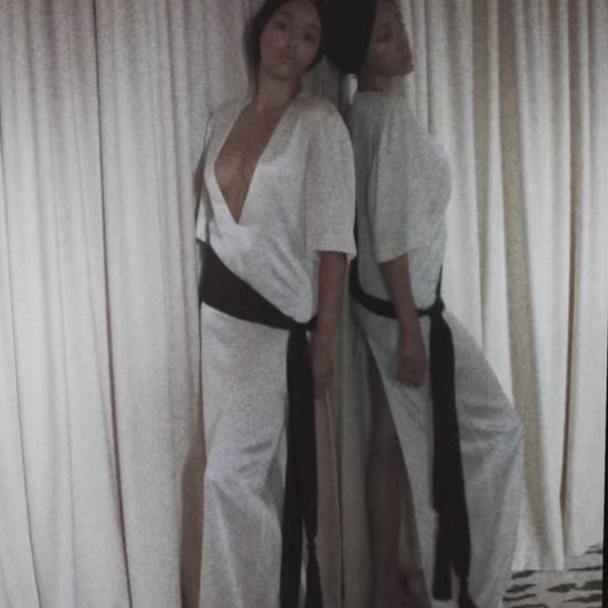 Satin cummerbund with 100% silk scarves. One size fits all. Made in Montreal.